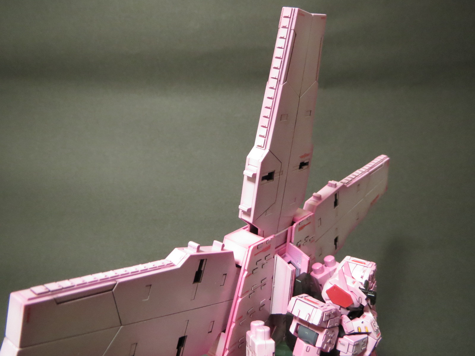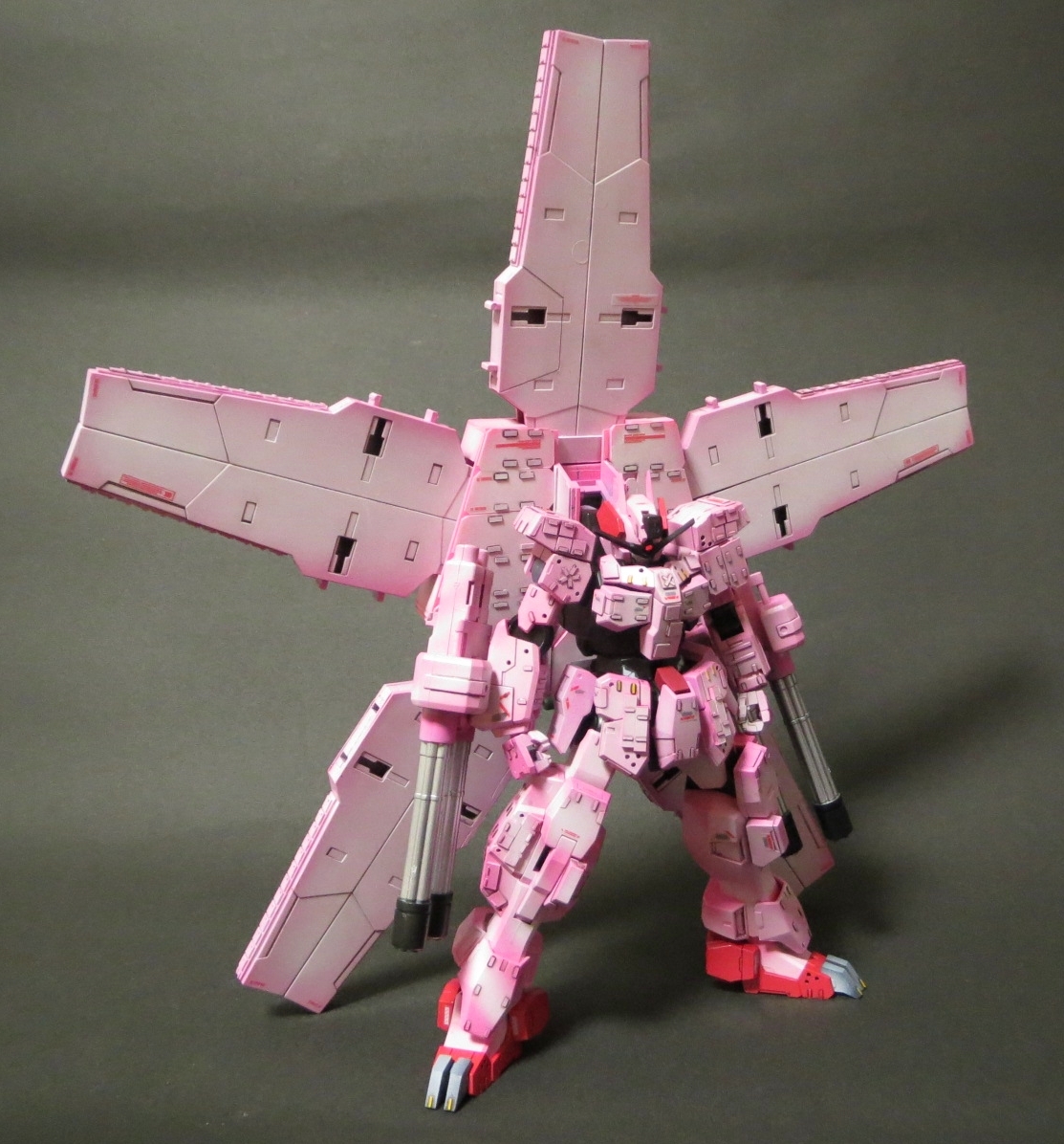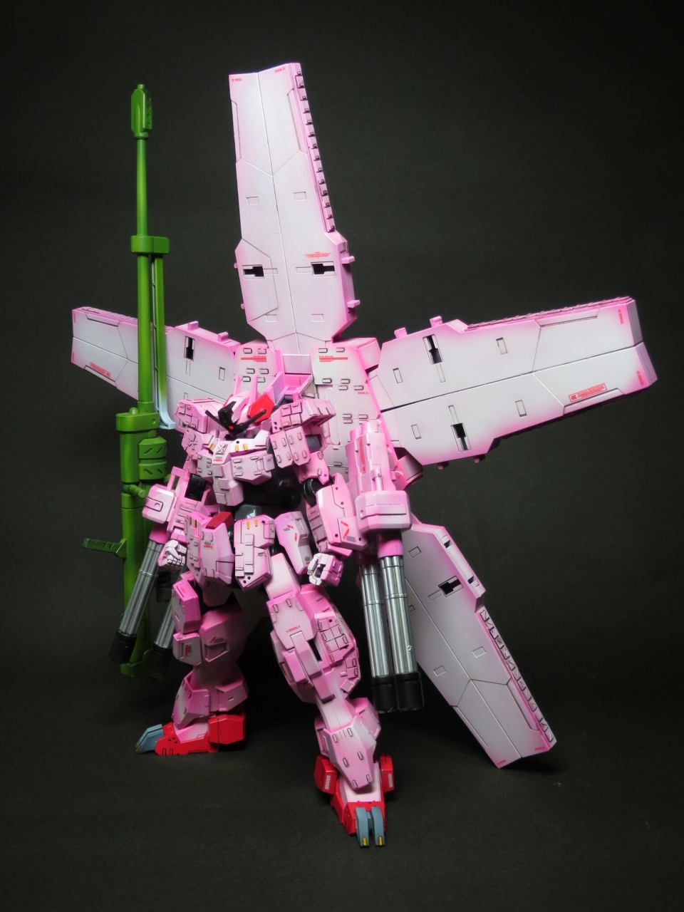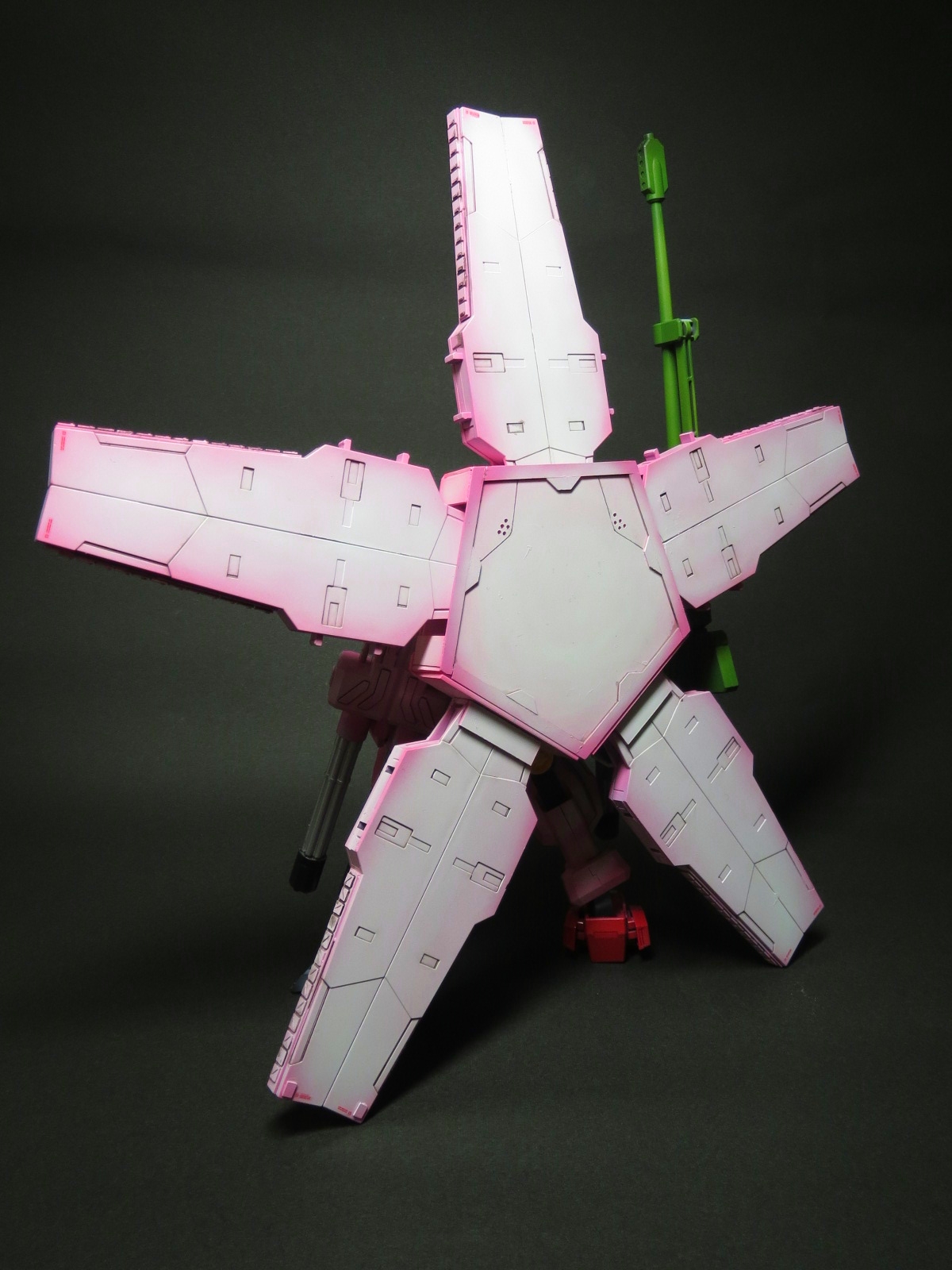 ミリタリー色が濃かったサバーニャを思い切ってピンク色にし、桜の花びらを模した背負いものと、武装のほとんど全てを「ばらまく系」のものとすることで、桜吹雪を表現しました。装甲のディテールは戦車のものを参考にしました。